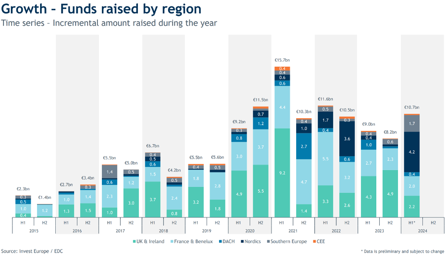 European growth equity activity in 2024 has been led by the continent’s strongest economies, with notable shifts among regions. Western Europe remains dominant, especially France & Benelux and the UK & Ireland. In 2023, companies in France & Benelux attracted the most growth funding at about €7.8 billion, slightly surpassing the UK–Ireland region. The UK still boasts Europe’s deepest investor base – London remains a hub for large growth equity managers and accounted for the largest fundraising in H1 2024 (over €20 billion in UK/Ireland). DACH (Germany, Austria, Switzerland) and the Nordics also contribute significantly; industry surveys anticipated the strongest deal growth in 2024 to come from DACH, followed by France and the Nordics. These Western European hubs benefit from mature ecosystems and a steady flow of tech scale-ups seeking growth capital.