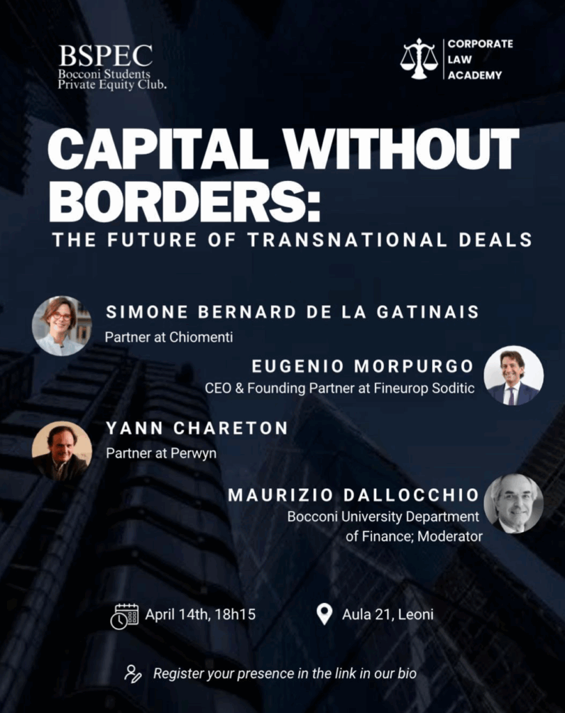 On Monday, April 14th, 2025, Bocconi Students Private Equity Club had the pleasure of hosting the conference: “𝐂𝐚𝐩𝐢𝐭𝐚𝐥 𝐖𝐢𝐭𝐡𝐨𝐮𝐭 𝐁𝐨𝐫𝐝𝐞𝐫𝐬 𝐓𝐡𝐞 𝐅𝐮𝐭𝐮𝐫𝐞 𝐨𝐟 𝐓𝐫𝐚𝐧𝐬𝐧𝐚𝐭𝐢𝐨𝐧𝐚𝐥 𝐃𝐞𝐚𝐥𝐬”, organized in collaboration with Corporate Law Academy.