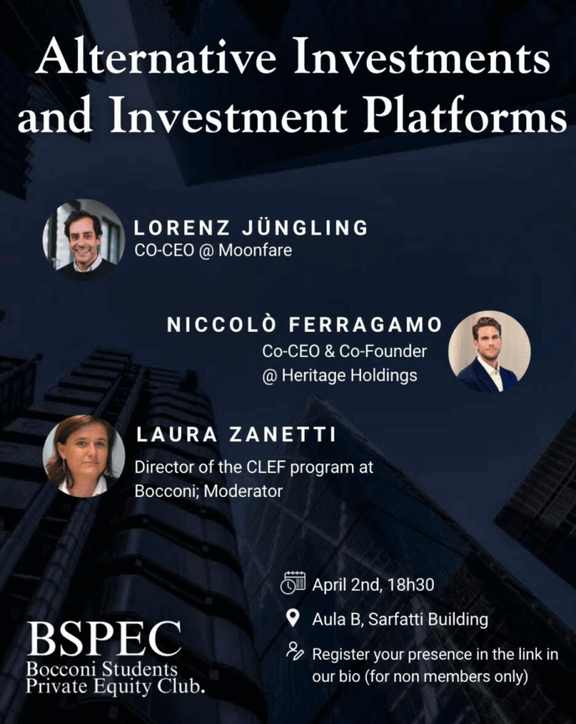 BSPEC had the privilege of hosting Lorenz Jüngling (Co-CEO, Moonfare) and Niccolò Ferragamo (Co-CEO & Co-Founder, Heritage Holdings) for an in-depth discussion on the evolution of alternative investments and digital investment platforms. The session was moderated by Professor Laura Zanetti (Associate Professor of Corporate Finance at Bocconi).
