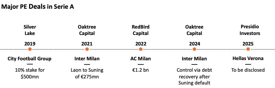 Several headline-grabbing deals since the late 2010s highlight private equity’s growing presence in football. Silver Lake’s $500 million investment in City Football Group and RedBird Capital’s €1.2 billion acquisition of AC Milan stand out among the most notable. Meanwhile, Chelsea’s record-breaking sale and major league-level deals in La Liga and Serie A reflect a broader trend of capital targeting both clubs and broadcasting revenues.
