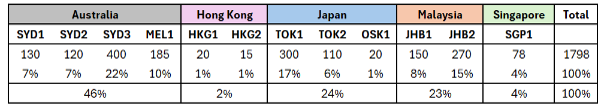 AirTrunk operates primarily in APAC regions, more specifically in Australia, Japan, Singapore, Hong Kong, and Malaysia, with additional land and resources that could support an additional 1 GW of expansion. These sites collectively represent over 800 MW of contracted capacity (Mergr, 2023). Its size and success position the company in a privileged spot at the forefront of global interest in data-driven infrastructure investments. AirTrunk is capable of realising new facilities cheaper and faster than traditional builders thanks to its advanced engineering model, based on modular design and rapid deployment.